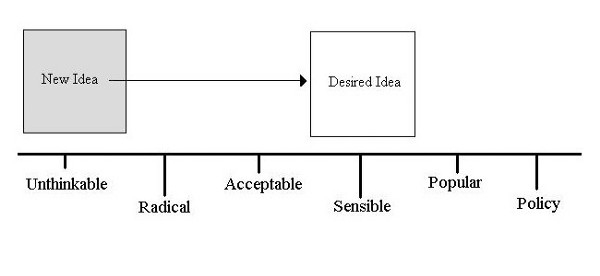 The Overton window, sometimes known as ‘window of discourse’, is useful for gaining understanding how ideas move in and out of the range of cultural acceptability. Proponents of political or cultural views outside the window seek to persuade or educate the public so that the window expands to encompass them. Opponents to the ideas, currently within the window, will likewise seek to convince the public that these ideas should be considered unacceptable.