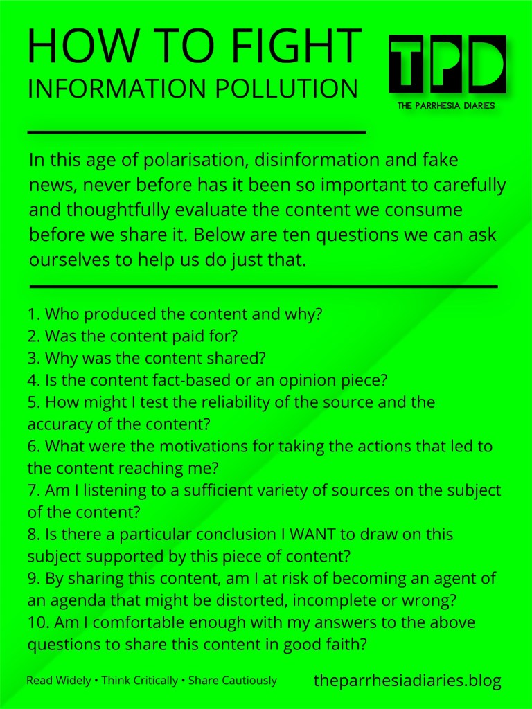 For instance, before posting content on social media, we might, for due diligence purposes, ask ourselves a series of questions to determine whether what we are about to share is likely to increase or decrease the pollution in the information environment. This is a principle I’ve personally adopted. Below are ten questions I ask myself that focus on four variables; the content itself, the source of the content, the subject matter and my own engagement with the content, source and subject: