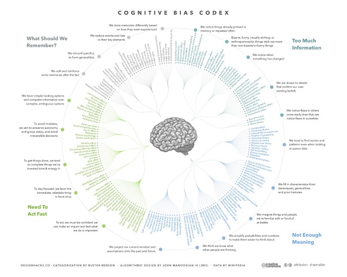 The Cognitive Bias Codex Chart is the most comprehensive list of known biases, detailing no less than 188 different types. Click on the image below for a high-definition version of the chart.